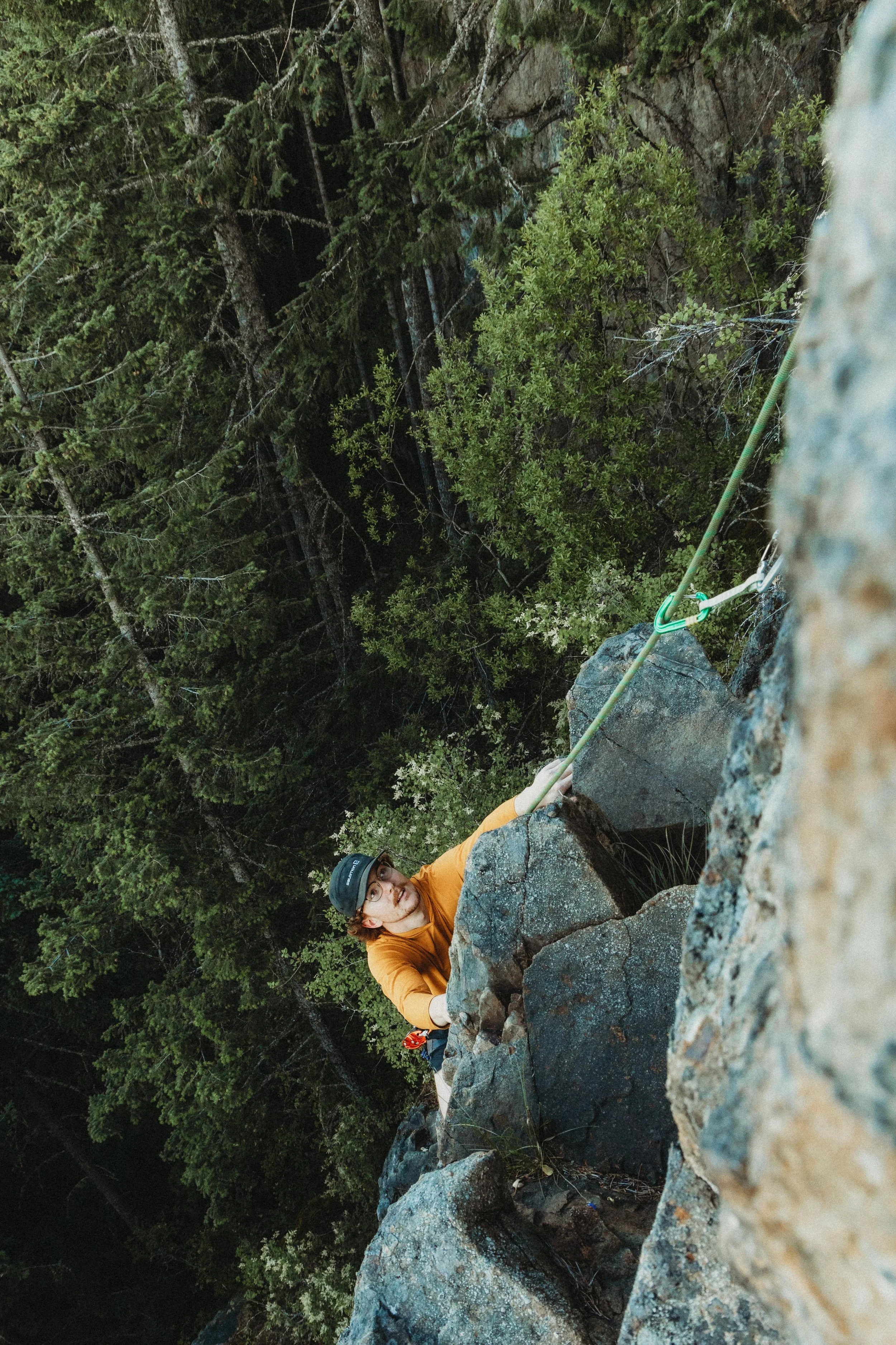 Initially I thought we could climb at that spot on the river. I pictured these insane visuals of a climber halfway up a cliff face with the river slightly out of focus below him. Colby recommended a different spot up Mount Benson not far from Ammonite Falls. I’d never been there before but I trusted his expertise and met him at the planned time with my camera bag, drone and my harness in tow. Colby invited his friend Tom along who seemed slightly less experienced and definitely eager to learn more from Colby. We hiked the winding and steep trail up to the face. These two guys did it effortlessly while I took many breaks, desperate to catch my breath. “You alright?” they called down to me. Just dying… I eventually caught up, legs on fire and heart pounding. I’ve definitely got some work to do in regards to getting in shape.